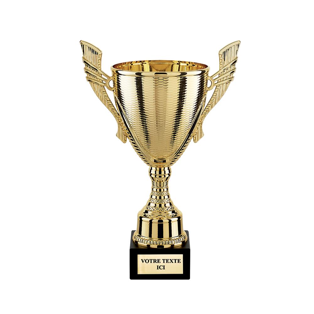 • Vous pouvez personnaliser ce trophée avec une plaque Gravoply rigide de 60x20 mm (Réf. GRA), couleur or, le texte en noir.