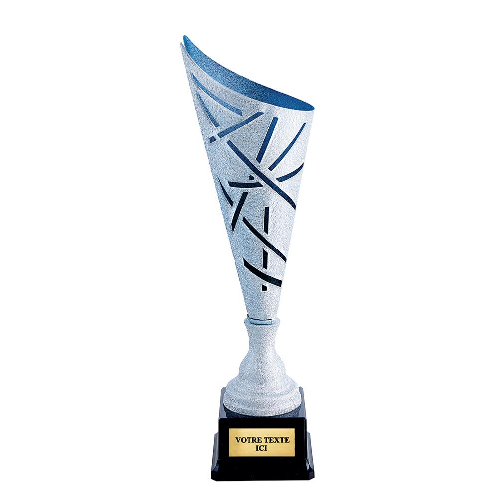 Coupe argent bleu mat sur un socle noir