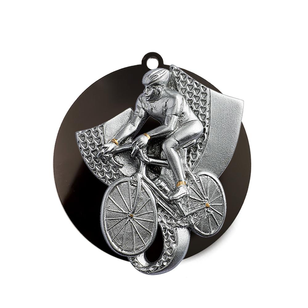 Cette médaille cyclisme de 70 mm en acrylique est conçue pour honorer les performances dans les disciplines du vélo, telles que le cyclisme sur route, le VTT ou le BMX. Elle est ornée d’une applique en résine représentant un cycliste en pleine course, dans une posture dynamique, avec des détails argentés et un fond texturé qui accentuent le mouvement.