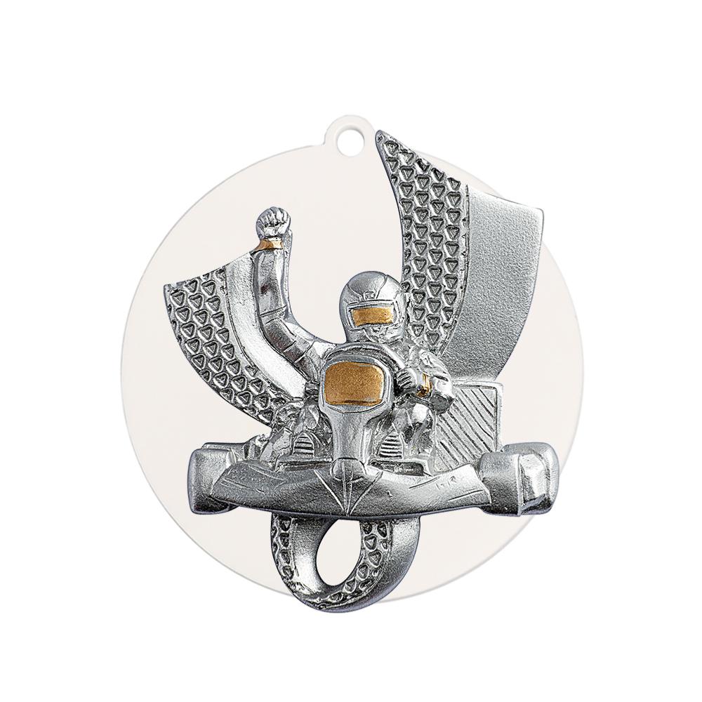 Cette médaille karting de 70 mm en acrylique est conçue pour célébrer les performances en course de kart. Elle est ornée d’une applique en résine représentant un pilote de kart en tenue de course, levant le bras en signe de victoire, avec un design dynamique et des détails argentés et dorés.