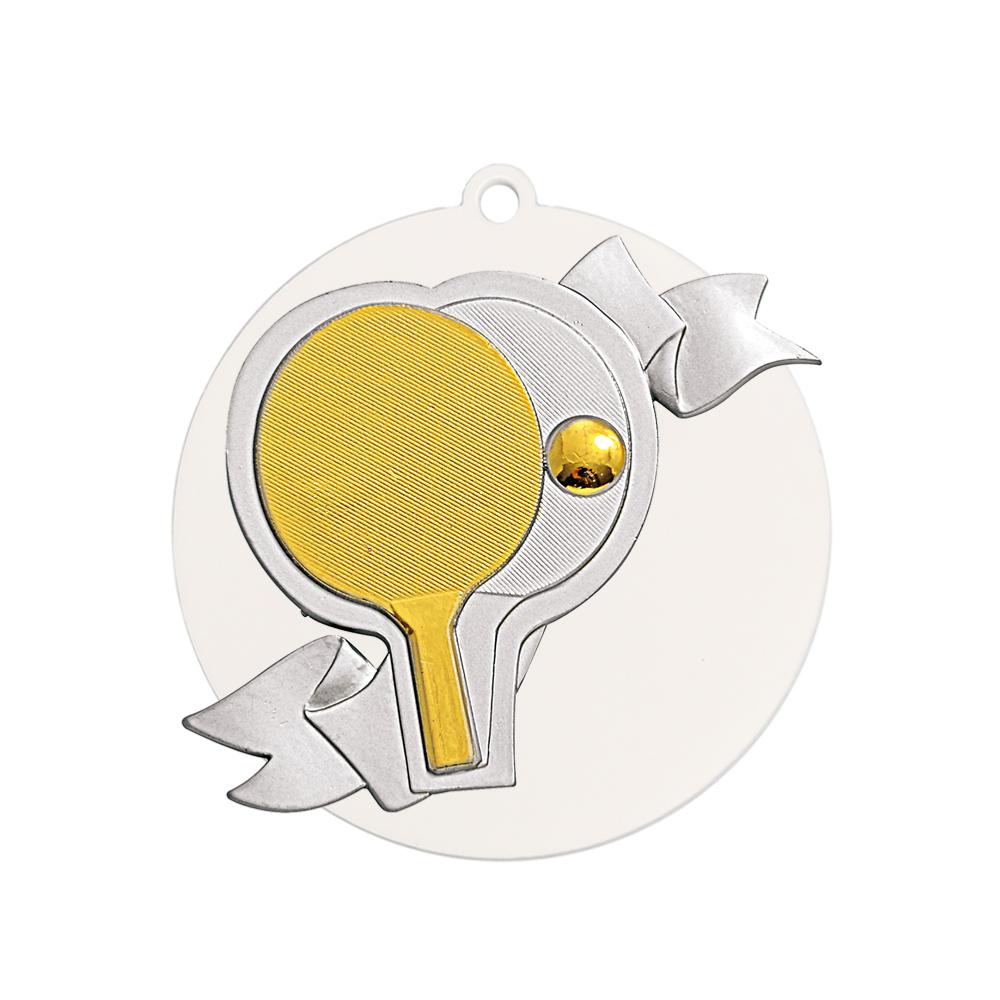 finement sculptée. Le design met en avant une raquette jaune accompagnée d’une balle assortie, toutes deux mises en valeur sur un fond argenté orné de rubans stylisés. Ce visuel dynamique évoque la vivacité et la précision propres au tennis de table. Le contraste entre les matériaux et les couleurs confère à cette médaille une allure moderne et sportive. Parfaite pour récompenser les réflexes, la concentration et la maîtrise technique, elle incarne les valeurs fondamentales du tennis de table.