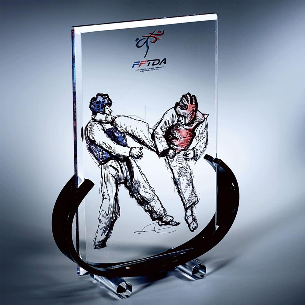 Ce trophée plexiglas transparent repose sur une base noire élégante, offrant une belle stabilité et un contraste raffiné. Son design épuré et sa surface lisse sont parfaits pour une personnalisation sur mesure, idéale pour les remises de prix sportives, professionnelles ou associatives.