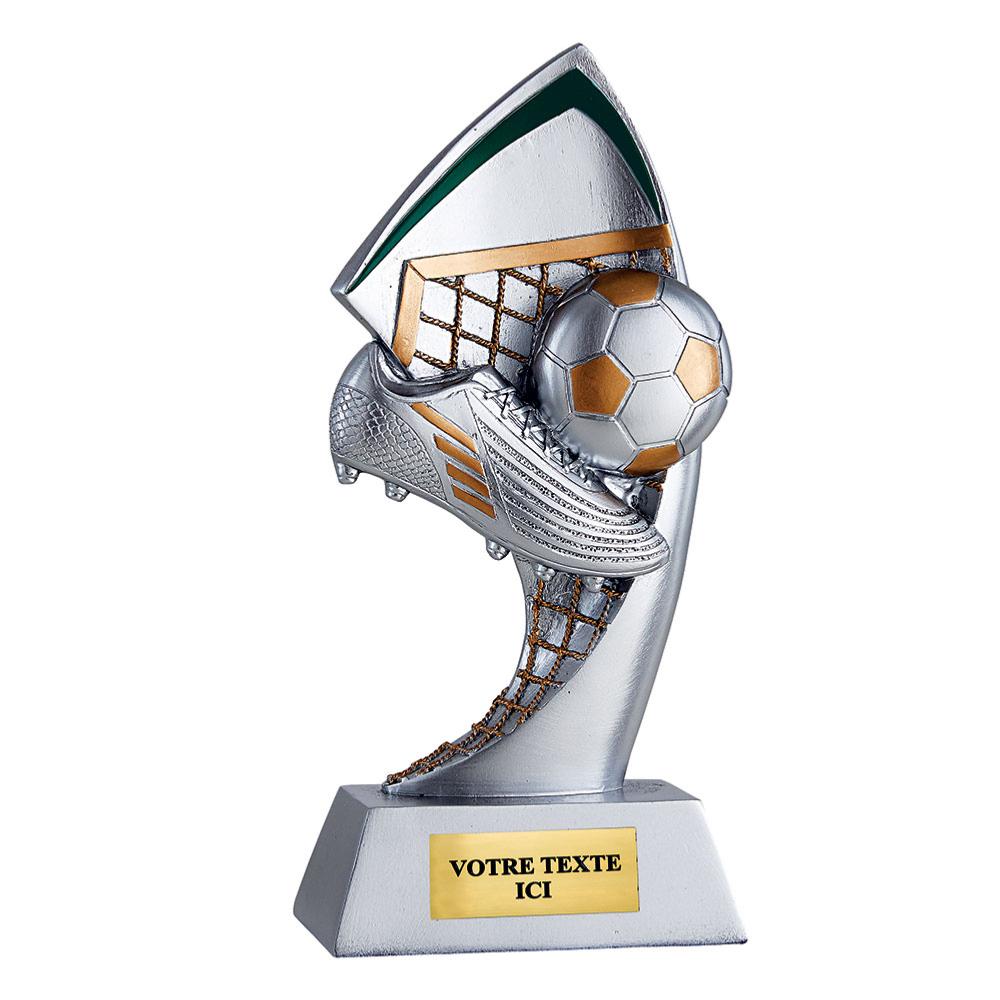 Ce trophée foot en résine argentée met en scène les trois éléments emblématiques du football : le ballon, la chaussure et le filet. Son design compact et dynamique en fait une récompense idéale pour vos tournois, matchs amicaux ou remises de prix.