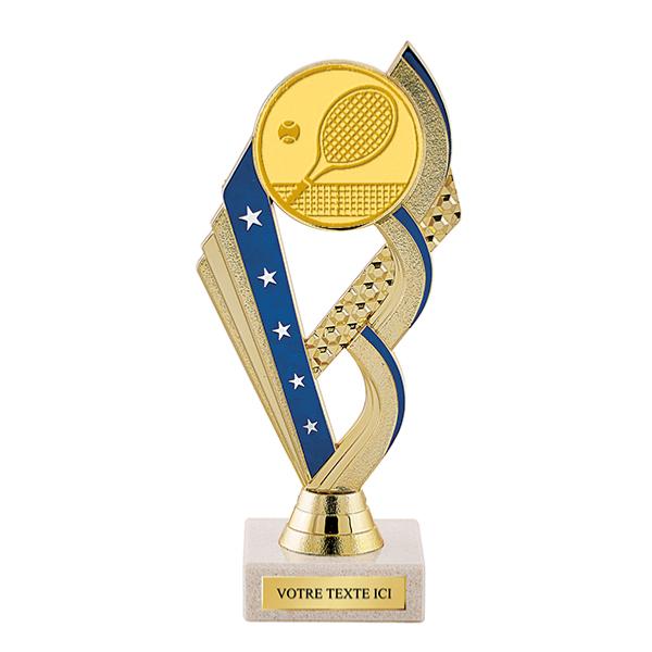Ce trophée porte-centre en plastique doré est une récompense légère et dynamique, idéale pour célébrer les premières places. D’une hauteur de 19 cm et d’un poids de 180 g, il arbore un design moderne avec trois étoiles dorées sur un support arqué, mettant en valeur un emblème central personnalisable (discipline au choix). La pastille en aluminium doré est à coller par vos soins à l’aide de l’adhésif double-face fourni. Une plaque frontale permet également d’ajouter votre propre texte ("VOTRE TEXTE ICI"), pour une personnalisation complète et valorisante.