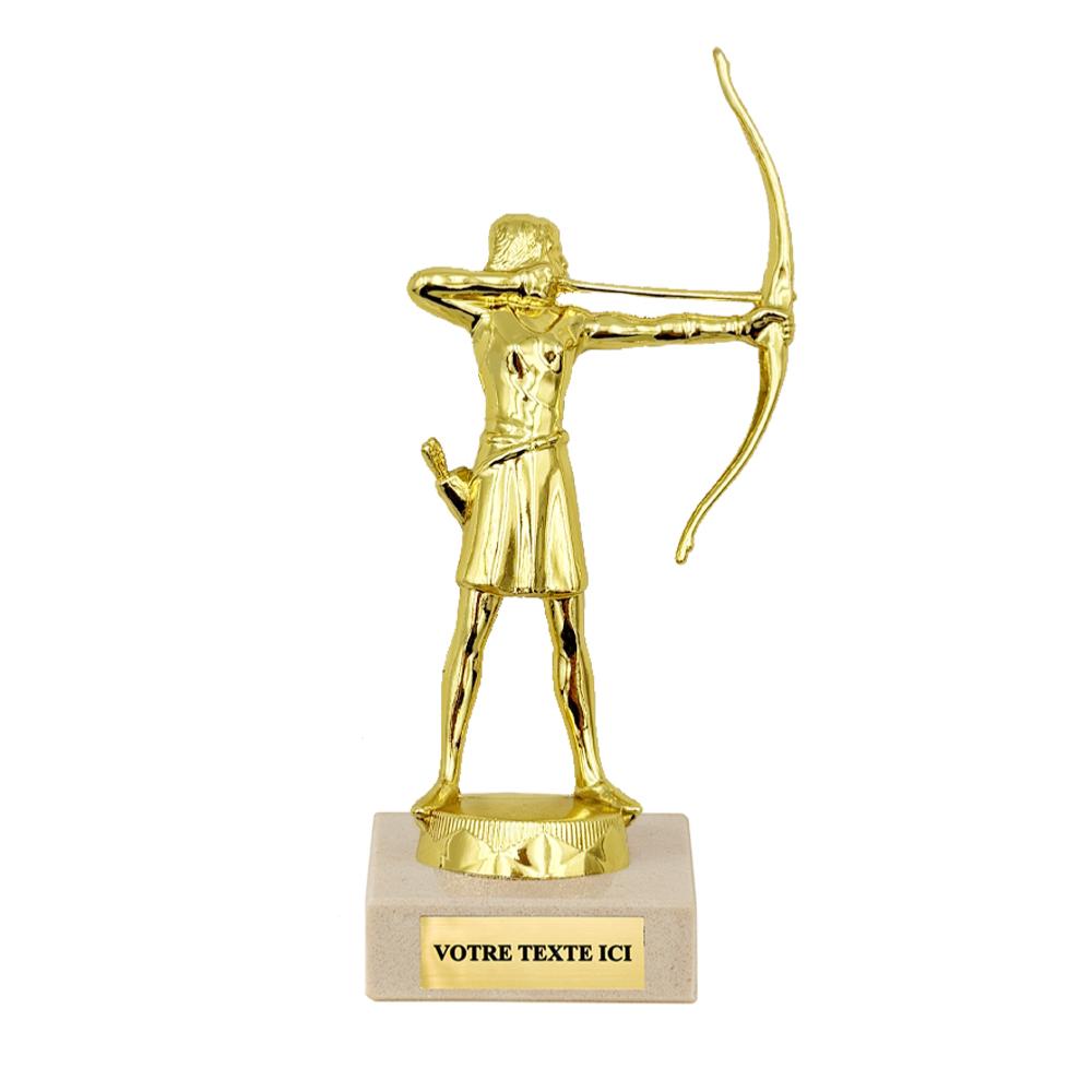Ce Trophée tir à l'arc femme représente une archère en pleine action, sculptée en métal doré. Elle est debout, les jambes légèrement écartées, tenant un arc tendu avec une flèche prête à être décochée, illustrant la concentration et la précision du tir. La figurine est vêtue d’une tunique courte, avec les cheveux attachés, soulignant le mouvement et la posture sportive. Elle repose sur un socle rectangulaire en marbre clair, qui apporte stabilité et élégance.