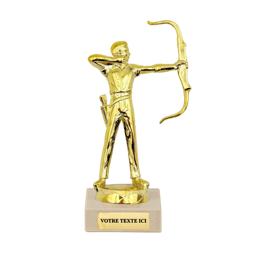 Ce Trophée tir à l'arc homme représente un archer en pleine action, sculpté en métal doré. L’homme est debout, les jambes légèrement écartées, tenant un arc tendu avec une flèche prête à être décochée, illustrant la concentration et la précision du tir. La figurine est riche en détails : vêtements sculptés, ceinture visible, et carquois attaché sur le côté gauche, renforçant l’authenticité de la posture. L’ensemble repose sur un socle rectangulaire en marbre beige clair, qui apporte stabilité et élégance.