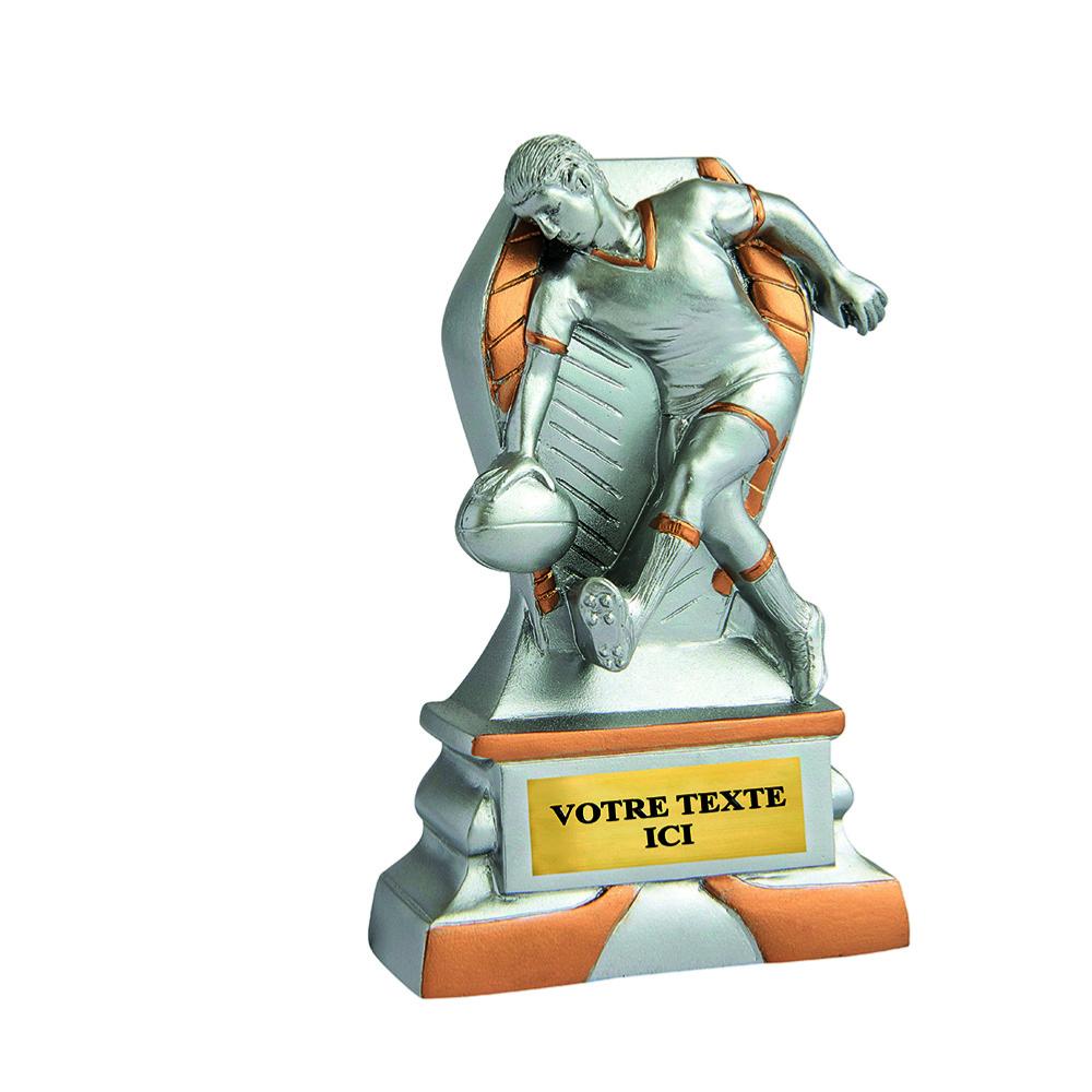 Ce trophée rugby représente un joueur de rugby en pleine course, tenant fermement le ballon. Fabriqué en résine, il présente une finition argentée avec des accents bronze, mettant en valeur les détails du mouvement et de l’équipement. La base est équipée d’une plaque personnalisable, idéale pour inscrire un texte, un nom ou une date. Ce modèle est parfait pour récompenser les performances lors de tournois ou d’événements liés au rugby..