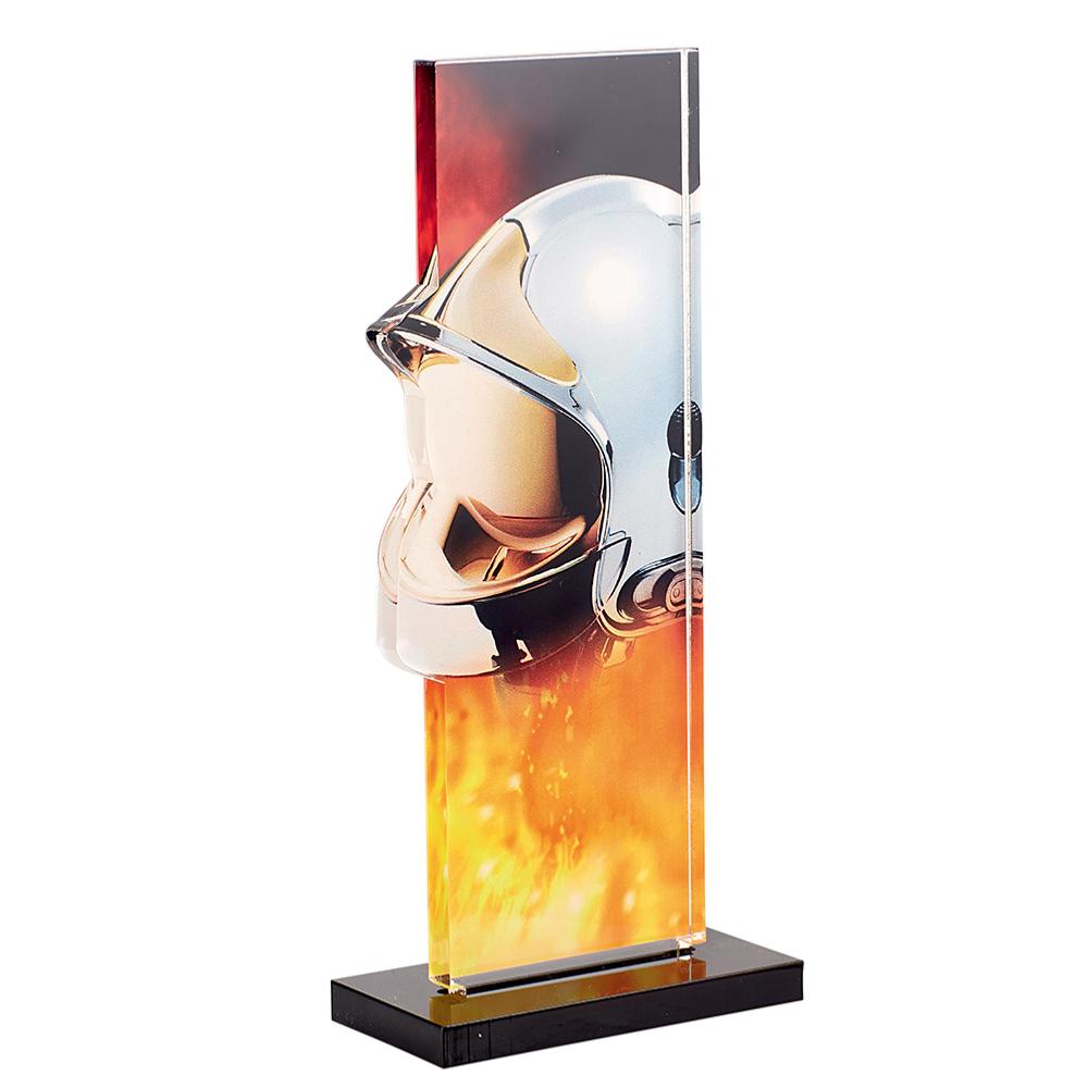 Trophée pompier en plexiglas couleur sur un socle noir, impression numérique sur face arrière et découpe dans une plaque en plexiglas transparente